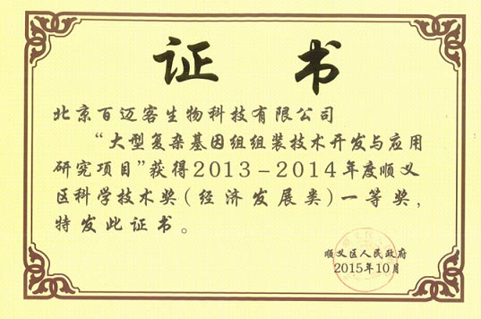 1月19日上午9:00,順義區(qū)科技技術(shù)獎(jiǎng)勵(lì)大會在北京市順義賓館隆重召開,北京市科學(xué)技術(shù)委員會張光連副主任、順義區(qū)政府朱家亮副區(qū)長、順義區(qū)科學(xué)技術(shù) 委員會金泰希主任及區(qū)各委、辦、局、園區(qū)、鎮(zhèn)代表出席了本次大會。大會對獲得2013年至2014年度的科學(xué)技術(shù)獎(jiǎng)的單位進(jìn)行了表彰。其中百邁客公司自主 研發(fā)的《大型復(fù)雜基因組組裝技術(shù)開發(fā)與應(yīng)用研究》項(xiàng)目榮獲經(jīng)濟(jì)發(fā)展類獎(jiǎng)項(xiàng)一等獎(jiǎng)。