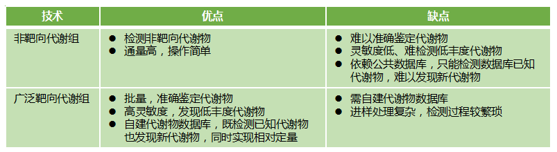 非靶向代謝組和廣靶代謝組是目前代謝組學常用的技術。非靶向代謝組是將對照組和實驗組樣本的全部代謝物進行比對,以找出其代謝物的差異。廣靶代謝組是高通量、高靈敏度靶向代謝物檢測技術,提供了定性、定量檢測大批量、低豐度代謝物高效的方法, 有助于全面解析差異代謝物與代謝途徑。