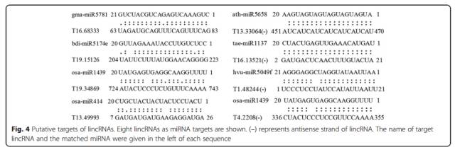 利用psRNATarget軟件及miRbase數(shù)據(jù)庫信息從DE-lincRNA中篩選miRNA的靶標,找到101個靶標lincRNA。其中有6個miRNA被本實驗室先前的small RNAseq 驗證過,并且這6個miRNA是跟小麥白粉病相關的。