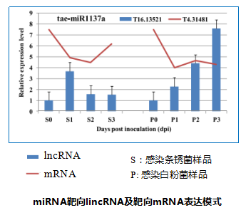 對miRNA的靶標lincRNA和靶標mRNA的調控作用關系進行驗證,發(fā)現(xiàn)經(jīng)Pst 或Bgt侵染后共同表達的lincRNA及共同表達的mRNA大都表現(xiàn)出了相反的表達模式。表明,小麥中l(wèi)inRNA可能通過與miRNA作用間接影響mRNA的表達。