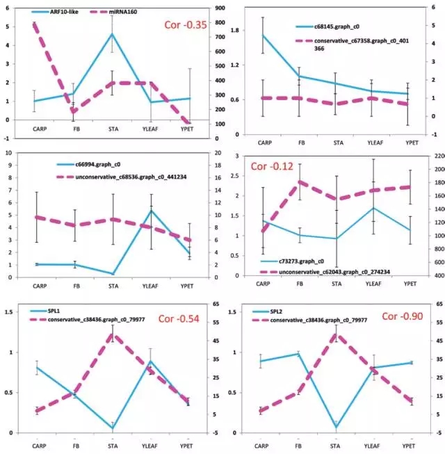 選取6個miRNA及其靶基因進(jìn)行表達(dá)驗(yàn)證,發(fā)現(xiàn)4對表現(xiàn)出負(fù)相關(guān)的關(guān)系。例如miRNA167靶向2個SPL基因,用qPCR進(jìn)行驗(yàn)證,結(jié)果顯示出強(qiáng)的負(fù)相關(guān)關(guān)系。