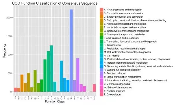 2.用BLASTX將組裝得到的序列與Nr,Swiss-Prot,GO,COG和KEGG數(shù)據(jù)庫進行比對,共有8288個Unigenes注釋到了25個COG類別中的11713個功能。有585個Unigenes注釋到“碳水化合物的運輸和代謝”。
