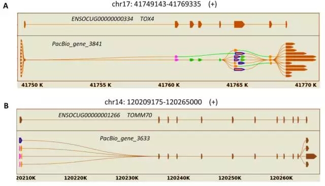 Figure 2. 三代測得轉錄本的不同isoforms,在數(shù)據(jù)庫中的參考基因模型如圖示中被標記有染色體位置、基因ID和基因名稱
