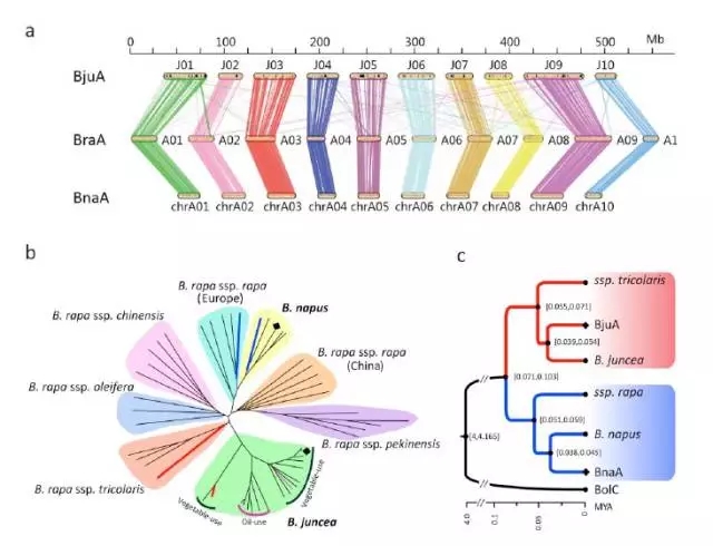 我們對10個菜用的芥菜、7個油用的芥菜,5個甘藍(lán)型油菜基因組、27個白菜基因組(多亞種)進(jìn)行了重測序分析,并繪制如上圖b中的進(jìn)化樹。從b圖中可以看到芥菜全部聚在一起,沒有出現(xiàn)分散的情況,說明芥菜中A的基因組是來源于同一個亞種,屬于單系起源。