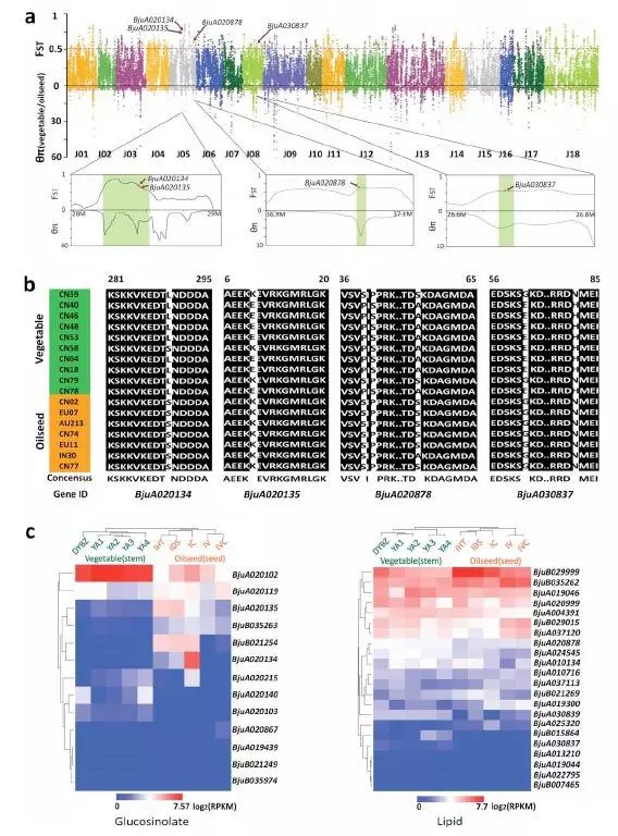 通過菜用和油用芥菜群體進(jìn)行選擇清除分析,發(fā)現(xiàn)dominance的基因被篩選出來的比例較高,同時結(jié)合轉(zhuǎn)錄組數(shù)據(jù),這部分基因在油用和菜用兩個群體中差異表達(dá)。同時通過上面的分析發(fā)現(xiàn)與硫苷,脂類代謝顯著相關(guān)并且存在dominance的基因組,這些基因在油用菜用群體中有各自獨特基因分型。