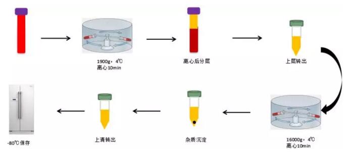 使用EDTA抗凝管采集血液樣品(采集后的血液樣品可置于室溫或4℃短暫保存,但不得超過(guò)1h)。1900g(或3000rpm),4℃,離心10min。小心轉(zhuǎn)移上層血漿(黃色)至新的1.5ml離心管中,槍頭不要觸碰中間層(白細(xì)胞和血小板層)。一般情況下,10ml的血液可分離出4-5ml血漿。將分離出的血漿16000g,4℃,離心10min。槍頭不要觸碰到管底一側(cè)的雜質(zhì),小心轉(zhuǎn)移上清到一個(gè)新的1.5ml離心管中,-80℃保存。大體積干冰運(yùn)輸。