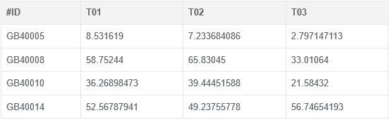 默認首行、首列為表頭,一般每列表示一個樣品,每行表示一個基因,也可統(tǒng)計其他含義的數(shù)據(jù)矩陣。除表頭外,參與統(tǒng)計繪圖的內容應為純數(shù)字,文件范例如下: