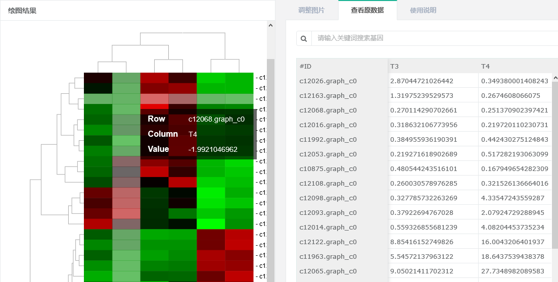 c 選中行聚類樹某分枝后,可在“查看原數(shù)據(jù)”也篩選出對應行并下載。