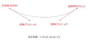 二次貝塞爾曲線Q,只需要一個(gè)控制點(diǎn),用來(lái)確定起點(diǎn)和終點(diǎn)的曲線斜率。因此它需要兩組參數(shù),控制點(diǎn)和終點(diǎn)坐標(biāo)。