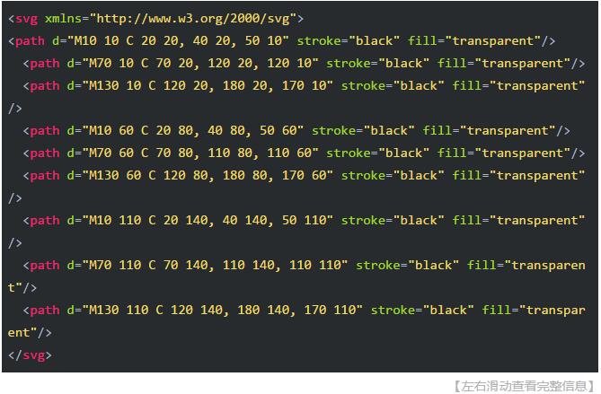 【需要注意】,T命令前面必須是一個(gè)Q命令,或者是另一個(gè)T命令,才能達(dá)到這種效果。如果T單獨(dú)使用,那么控制點(diǎn)就會(huì)被認(rèn)為和終點(diǎn)是同一個(gè)點(diǎn),所以畫(huà)出來(lái)的將是一條直線。