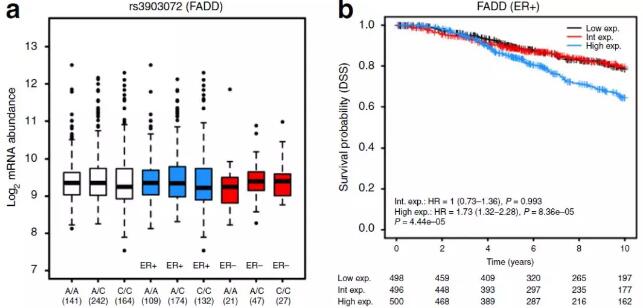 作者所納入的風(fēng)險(xiǎn)SNP在此之前只有一個(gè)位點(diǎn)(16q12.1-rs3803662)報(bào)道了與疾病預(yù)后相關(guān)。本研究中作者直接分析了代謝型乳腺癌隊(duì)列中潛在的靶基因的表達(dá)水平與的患者預(yù)后之間的關(guān)聯(lián)(分別對ER +和ER-亞組進(jìn)行生存分析)。其中32個(gè)靶基因(33%)與ER +乳腺癌患者的DSS相關(guān),6個(gè)DSS相關(guān)的靶基因?yàn)閑QTL靶基因。