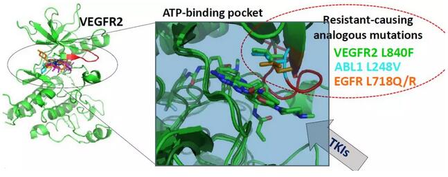 西班牙國(guó)家癌癥研究中心(CNIO)胃腸癌臨床研究組的學(xué)者們,納入一例RAS / BRAF / PIK3CA未發(fā)生突變且對(duì)抗VEGF抑制劑具有抗性的轉(zhuǎn)移性結(jié)腸直腸癌患者,收集其血漿提取cfDNA,分離白細(xì)胞提取gDNA以及轉(zhuǎn)移組織提取tDNA,進(jìn)行全外顯子組測(cè)序,發(fā)現(xiàn)WES-cfDNA與腫瘤外顯子組測(cè)序結(jié)果一致率為77%,且能夠鑒別KDR / VEGFR2 L840F克隆,該體細(xì)胞突變是患者難治性的原因。其他腫瘤數(shù)據(jù)庫(kù)如TCGA等KDR體細(xì)胞突變的樣本比例在1-3%,且位于其他癌癥相關(guān)激酶(如EGFR,ABL1和ALK)中經(jīng)常突變的蛋白質(zhì)殘基中。此外,作者還進(jìn)行了一系列功能實(shí)驗(yàn),包括不同細(xì)胞系VEGFR2突變體異位表達(dá)、激酶和藥物敏感性測(cè)定以及細(xì)胞和患者衍生的異種移植瘤實(shí)驗(yàn)。結(jié)果表明,L840F對(duì)抗血管生成藥物產(chǎn)生強(qiáng)烈的抗性,而KDR熱點(diǎn)突變體R1032Q賦予對(duì)強(qiáng)VEGFR2抑制劑的敏感性。小鼠移植瘤實(shí)驗(yàn)表明VEGFR2突變體D717V,G800D,G800R,L840F,G843D,S925F,R1022Q,R1032Q和S1100F 促進(jìn)小鼠腫瘤生長(zhǎng)。