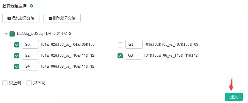 登錄百邁客云(www.biocloud.net)——進(jìn)入相應(yīng)項(xiàng)目【報告】——差異基因挖掘—差異表達(dá)基因集查詢——點(diǎn)擊相應(yīng)差異分組并選擇“只上調(diào)/只下調(diào)”,最后點(diǎn)擊“提交”。