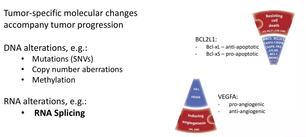 另外一個結(jié)腸癌標(biāo)志物相關(guān)的研究中,Malgorzata A Komor等[8]通過整合RNA-seq、Iso-seq及LC-MS/MS數(shù)據(jù)建立了一個適于臨床研究的蛋白組數(shù)據(jù)分析流程,從分析結(jié)果中可以發(fā)現(xiàn)除了DNA水平上的變異,RNA水平上發(fā)生的異常剪接也會導(dǎo)致癌癥的發(fā)生發(fā)展,比如在結(jié)直腸癌(CRC)中,SRSF1導(dǎo)致RAC1中exon 4的保留,產(chǎn)生了一種有助于癌細(xì)胞存活的Rac1b isoform;BCL2L1的可選擇性5 ‘ s端剪接事件的發(fā)生助于抵抗細(xì)胞死亡使;VEGFA的可選擇性3 ‘端剪接事件會導(dǎo)致癌癥中抗血管生成的isoform的轉(zhuǎn)變,并誘導(dǎo)血管生成。