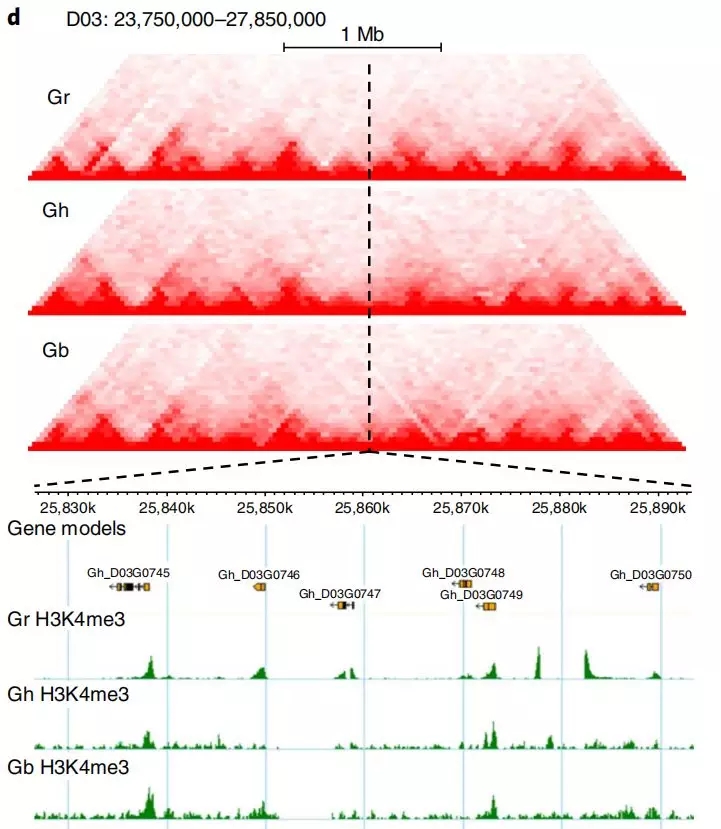 例如,在棉花的三維基因組進(jìn)化文章中,作者對(duì)二倍體雷蒙德氏棉、二倍體亞洲棉、四倍體陸地棉和四倍體海島棉構(gòu)建了三維基因組圖譜,與雷蒙德氏棉D(zhuǎn)03染色體相比,陸地棉和海島棉對(duì)應(yīng)的D亞基因組中發(fā)生了染色質(zhì)重排,虛線對(duì)應(yīng)的TAD結(jié)構(gòu)發(fā)生了變化,雷蒙德氏棉中該TAD結(jié)構(gòu)完整,存在明顯的邊界,陸地棉中該邊界發(fā)生了左移,而海島棉中該TAD趨向于消失。因而通過鑒定TAD發(fā)生變化區(qū)域的基因,可以研究多倍化過程中基因表達(dá)調(diào)控的改變(研究多倍體的老師們,這可是一個(gè)很好的套路文章哦)。同時(shí)結(jié)合ChIP-seq數(shù)據(jù)對(duì)該TAD邊界進(jìn)行分析發(fā)現(xiàn),雷蒙德氏棉富含豐富的H3K4me3(活性染色質(zhì)標(biāo)記),而陸地棉和海島棉中H3K4me3顯著減少,說明在棉花的多倍化與表觀遺傳修飾存在密切關(guān)聯(lián)。