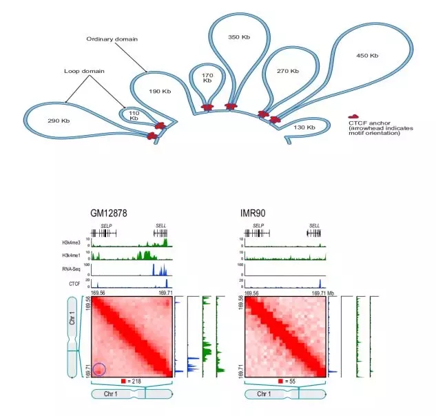 例如,在人的loop文章中,作者在GM12878細(xì)胞系發(fā)現(xiàn)9448個(gè)loop,其中2854個(gè)loop與已知的啟動(dòng)子-增強(qiáng)子作用相關(guān),基因的啟動(dòng)子存在loop比不存在loop時(shí)的表達(dá)量顯著增加。GM12878細(xì)胞系中存在一個(gè)Loop,這個(gè)Loop連接了SELL啟動(dòng)子和一個(gè)遠(yuǎn)端增強(qiáng)子SELP,基因開啟轉(zhuǎn)錄,表達(dá)量增加,而IMR90細(xì)胞系中沒有這個(gè)Loop,基因不表達(dá)。