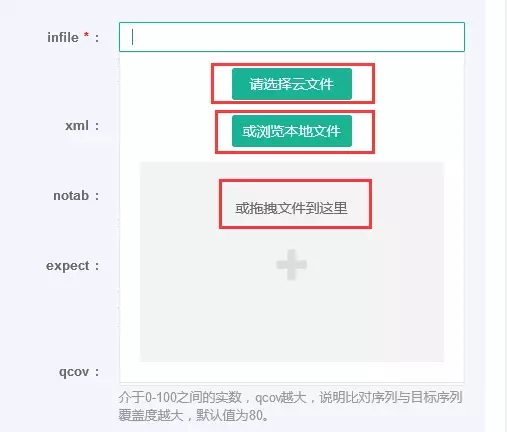 infile :在輸入比對(duì)的序列文件時(shí),有三種方式,包括選擇云文件、瀏覽本地文件或拖拽文件