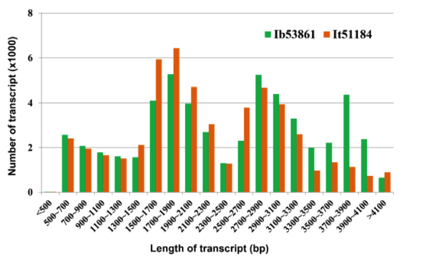 圖3. 在甘薯(Ib53861)和野生甘薯(It51184)中的53,861個(gè)非冗余轉(zhuǎn)錄物的數(shù)量和長(zhǎng)度分布。