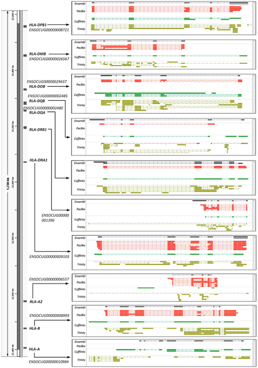 Figure 4.基因通過(guò)PacBio所測(cè)轉(zhuǎn)錄本和組裝得到的轉(zhuǎn)錄本還原10個(gè)MHC基因。染色體定位、命名和每個(gè)基因的Ensembl編號(hào)(在左側(cè))