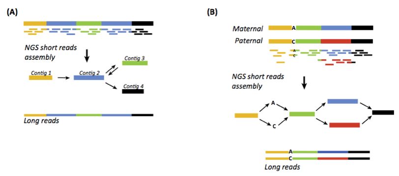 圖1 三代Nanopore測(cè)序Long reads解決高重復(fù)(A)和高雜合(B)基因組組裝[1]