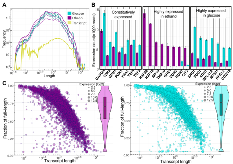 2、葡萄糖生長條件下的酵母共計獲得~509 MB(59X)數(shù)據(jù)量,包含約530,000高質(zhì)量reads,其中N50為1150bp;酒精條件下的酵母共計獲得~623 MB(72X)數(shù)據(jù),約623000 高質(zhì)量reads,其中N50為1263 bp;