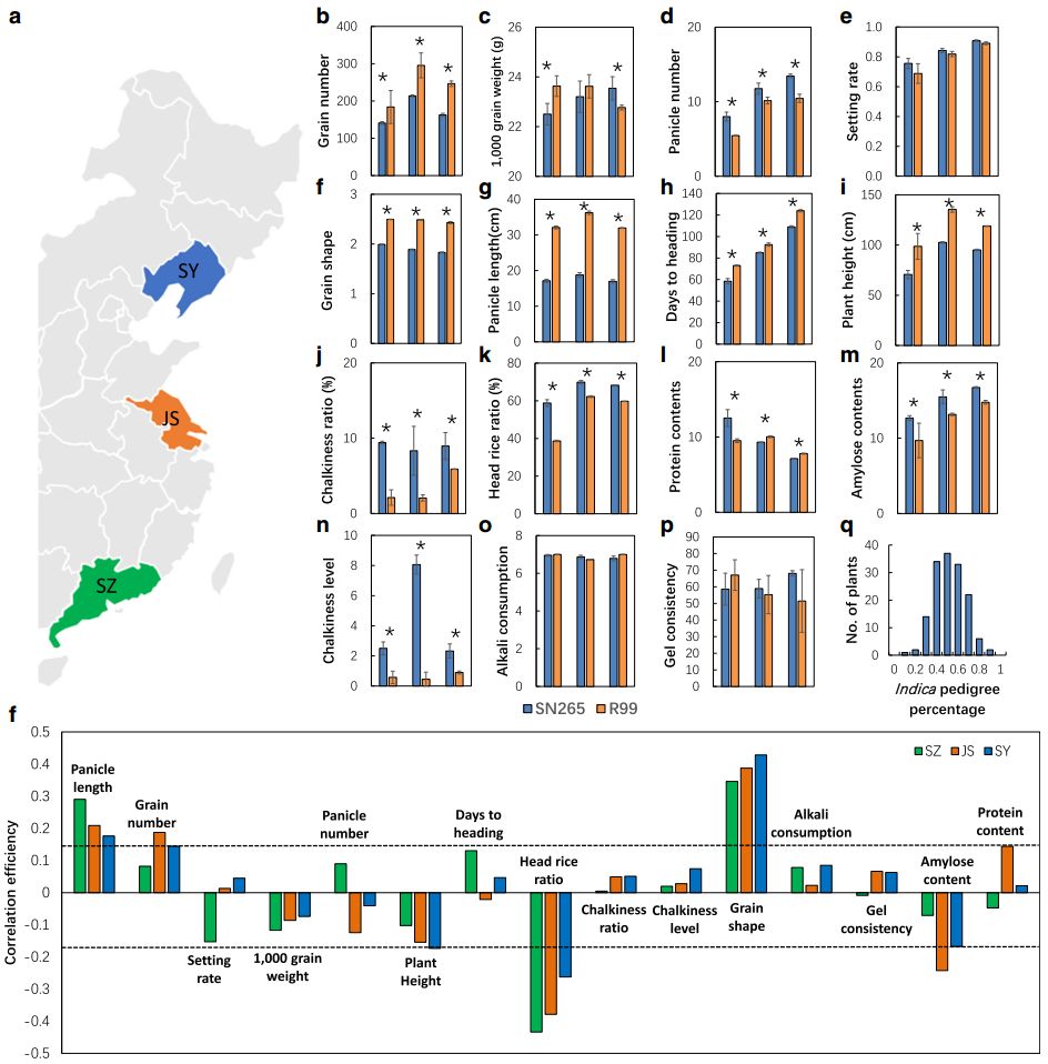 秈稻和粳稻為亞洲栽培水稻的兩個(gè)亞種,它們的地理分布以及形態(tài)學(xué)性狀差異明顯,揭示其農(nóng)藝性狀背后的遺傳基礎(chǔ)對于水稻生產(chǎn)非常重要,然而,其遺傳背景、生態(tài)條件以及農(nóng)藝性狀之間的關(guān)系尚不清楚。沈農(nóng)265(SN265)是我國第一個(gè)商用的超級稻,它作為中國北方骨干親本引領(lǐng)著育種方向。本研究利用二代和三代測序?qū)Ρ狈骄统壍維N265和R99進(jìn)行測序,并獲取SN265高質(zhì)量基因組,又構(gòu)建了RIL群體重測序遺傳連鎖圖譜,并對多個(gè)重要農(nóng)藝性狀進(jìn)行了QTL分析。此外,還發(fā)現(xiàn)若干基因功能隨生態(tài)環(huán)境的變化而改變,并且許多等位基因?qū)Σ煌倪z傳背景呈現(xiàn)差異性的響應(yīng)。