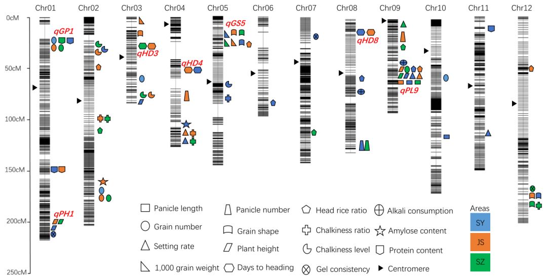 通過收集三個(gè)地點(diǎn)15個(gè)產(chǎn)量與質(zhì)量相關(guān)的表型數(shù)據(jù),進(jìn)行QTL的挖掘,結(jié)果共檢測到79個(gè)QTL,許多QTL呈現(xiàn)成簇分布的特點(diǎn),暗示多種性狀可能由一個(gè)基因或多個(gè)緊密連鎖的基因控制。有些QTL在3個(gè)環(huán)境下均被檢測到,另有一些位點(diǎn)僅在1個(gè)環(huán)境下被檢測到。