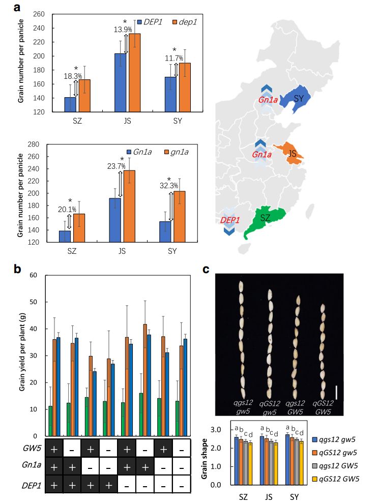 為了揭示生態(tài)環(huán)境與遺傳背景對基因功能的影響,首先,作者發(fā)現(xiàn)Gn1a對水稻單穗籽粒數(shù)目的貢獻(xiàn)主要集中在江蘇與沈陽兩個(gè)實(shí)驗(yàn)點(diǎn),而DEP1僅僅在深圳被檢測到是控制單穗籽粒數(shù)目的QTL(圖6)。對以上三個(gè)種植區(qū),又進(jìn)一步比較攜帶有 DEP1/dep1與Gn1a/gn1a的不同水稻材料,結(jié)果發(fā)現(xiàn)在高緯度生態(tài)區(qū)dep1對單穗籽粒數(shù)目的貢獻(xiàn)減少,而gn1a對其貢獻(xiàn)明顯增強(qiáng)(圖6)。類似地,DTH8、 SDG708與PHYB在江蘇均被檢測到,而PHYB在深圳也被檢測到,同樣, DTH8、 SDG708在沈陽也被檢測到;結(jié)果顯示DTH8、SDG708幾乎不會(huì)影響在深圳的抽穗期,PHYB在沈陽有較弱的作用(圖6)。概括起來,Gn1a、 SDG708、SD1與GW5的功能在高緯度地區(qū)被增強(qiáng),另一方面,PHYB與DEP1的功能隨著緯度的北移被破壞,有趣的是,DTH8在中緯度地區(qū)具有較強(qiáng)的功能,緯度的南移或北移都會(huì)削弱其功能。