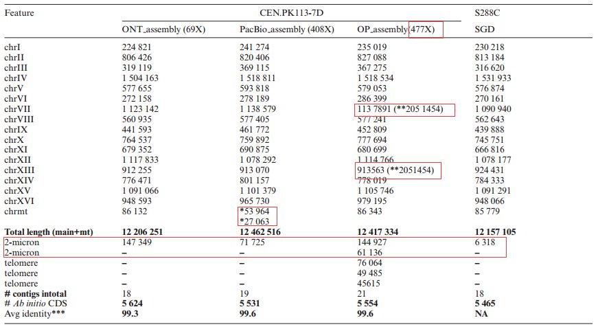對(duì)于不同測(cè)序平臺(tái)得到的基因組數(shù)據(jù),采用 3 種組裝方式:只用 MinIon 得到的數(shù)據(jù)進(jìn)行 de nove組裝得到 ONT_assembly;只用 PacBio 得到的數(shù)據(jù)進(jìn)行 組裝得到 PacBio_assembly;用 MinIon和 PacBio 得到的數(shù)據(jù)共同進(jìn)行 de nove 組裝得到 OP_assembly。然后使用 Illumina 的數(shù)據(jù)對(duì)組裝結(jié) 果進(jìn)行校正。三種組裝方式得到的 2μm 質(zhì)粒都比已知的 S288C 酵母的 2μm 質(zhì)粒更長(zhǎng),而ONT_assembly 的組裝結(jié)果很好,剛好組裝出 16 條染色體,1個(gè)線粒體序列,1個(gè)質(zhì)粒序列;PacBio_assembly 組裝的線粒體序列是斷裂開(kāi)的兩段;OP_assembly 組裝出的 contigs 最多,多出 3個(gè)端粒 DNA 片段,2 個(gè)質(zhì)粒片段,而且組裝時(shí)把 VII 染色體和 XIII 染色體的端粒區(qū)域連接在了一 起。 總體來(lái)看,三種組裝方式得到的基因組很相近,由于 OP_assembly 的測(cè)序深度最高,與 S288C酵母的平均比對(duì)率達(dá)到了 99.6%。