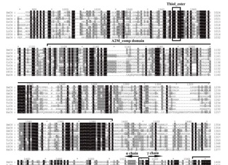 多重序列比對(duì)表明,硬骨魚和人的氨基酸高度保守。推導(dǎo)出的S.m-C4蛋白具有α-β連接子序列RXXR(在殘基668-671)和α-γ。連接序列RRXR(殘基1426-1429),其中C4氨基酸鏈被切割成三個(gè)鏈(α,β和γ鏈)。此外,保守的硫酯(GCGEQ)位點(diǎn)也定位在殘基1001至1005(圖5)。預(yù)測(cè)了TLR5由前21個(gè)氨基酸組成的信號(hào)肽和由14個(gè)氨基酸組成的跨膜螺旋。在膜結(jié)合型TLR5的LRR-CT中發(fā)現(xiàn)4個(gè)保守的半胱氨酸殘基,此外,還有9個(gè)蛋白結(jié)合區(qū)。結(jié)果表明,S.m-TLR5蛋白與銀大麻哈魚(91.5%)、大西洋鮭(91.7%)和衰白鮭(89.6%)的同源性較高,與鯉魚(48.1%)和金鯽(48.8%)的同源性較低。