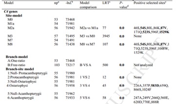 首先,利用位點(diǎn)模型探討C4基因中是否存在因其不同的分類地位和生存環(huán)境而正向選擇的位點(diǎn)。在模型中,只有M1a-M2a和M7-M8能夠檢測(cè)到正向選擇位點(diǎn)。M7-M8檢測(cè)到PP > 0.95的10個(gè)正向選擇位點(diǎn),其中9個(gè)位點(diǎn)也被M1a-M2a檢測(cè)到,表明魚C4基因的正向選擇。其次,利用分枝模型來探究這些正向選擇事件是否發(fā)生在特定的魚類譜系上,從而導(dǎo)致現(xiàn)在的魚或者祖先魚類。最后,利用分枝位點(diǎn)模型,在特定的現(xiàn)在和祖先譜系中檢測(cè)了這些位點(diǎn)。對(duì)于C6基因,M7-M8在正選擇壓力下僅檢測(cè)到一個(gè)位點(diǎn),而花羔紅點(diǎn)斑鮭或其他冷水魚中的分支位點(diǎn)未檢測(cè)到任何正選擇位點(diǎn)(表8)。