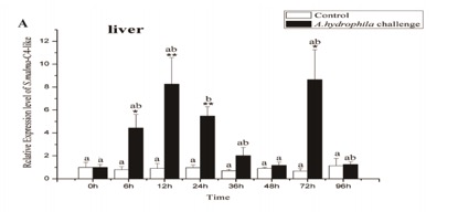 為探討這兩種免疫基因在細(xì)菌侵入的免疫應(yīng)答,采用定量實(shí)時(shí)PCR(qPCR)技術(shù),觀察注射后96h內(nèi)肝、脾臟相關(guān)基因的表達(dá)。對(duì)于鹽水處理組,即對(duì)照組,S.m-C4基因在研究的所有時(shí)間點(diǎn)肝臟中均無顯著差異(圖9)。對(duì)于嗜水氣單胞菌注射組,即實(shí)驗(yàn)組,肝臟在24小時(shí)有顯著增加(p=0.04),在12小時(shí)和72小時(shí)出現(xiàn)兩個(gè)峰值,邊緣顯著。在6h、12h、24h和72h,實(shí)驗(yàn)組與對(duì)照組有顯著性差異。對(duì)照組脾臟中S.m-C4基因的相對(duì)表達(dá)上下波動(dòng),8個(gè)時(shí)間點(diǎn)之間差異不顯著,實(shí)驗(yàn)組脾臟中S.m-C4基因的相對(duì)表達(dá)除72h外,其余時(shí)間點(diǎn)均無差異,與細(xì)菌注射組0 h相比減少59.6%。