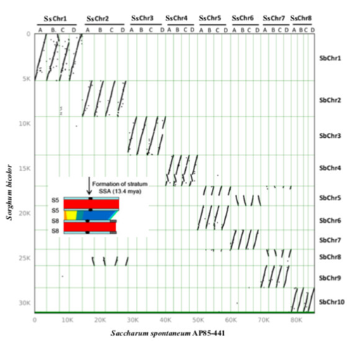 AP85-441基因組的組裝顯示了S.spontaneum的染色體數(shù)目從10降到8,而這與頻繁復(fù)制的古復(fù)制染色體對相關(guān),通過與高粱的聚類比對,發(fā)現(xiàn)高粱祖先5染色體和8號染色體同源物經(jīng)歷了染色體裂變(圖2)。SbChr05(A12)的祖先染色體斷裂分為兩個主要部分,即C5S(A12S)和C5L(A12L),分別轉(zhuǎn)移到SbChr06(A2)和SbChr07(A5)的祖先染色體;SbChr8(A11)的祖先染色體斷裂為兩個主要的部分,即C8S(A11S)和C8L(A11L),分別轉(zhuǎn)移到SbChr09(A6)和SbChr02(A7+ A9)的祖先染色體中。SbChr8和SsChr5之間及SbChr5和SsChr7之間近乎同源的短片段是在高粱與甘蔗分化前,高粱SSA形成于13.4MYA同源基因的殘留物,同時發(fā)現(xiàn),S5中較小的SSA區(qū)域和S8中SSA的較大區(qū)域在重排的AP85-441基因組中也是保守的。