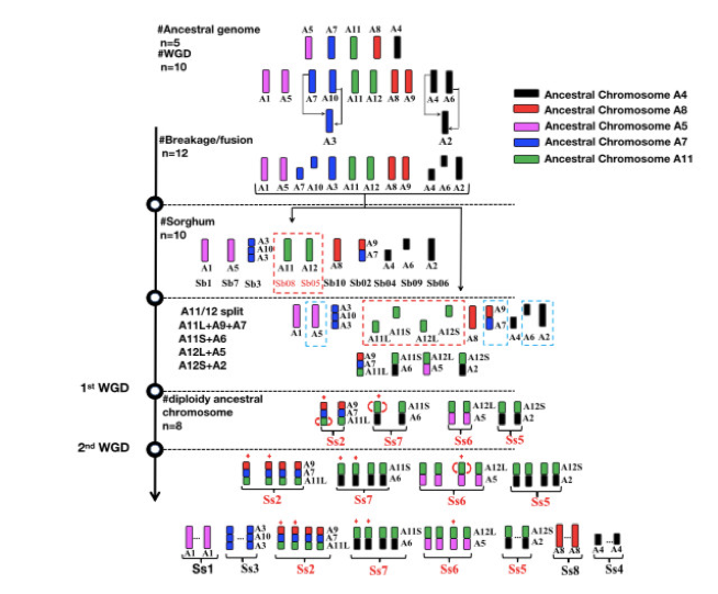 圖2 禾本科染色體數(shù)進(jìn)化(高粱n= 10到甘蔗n= 8)