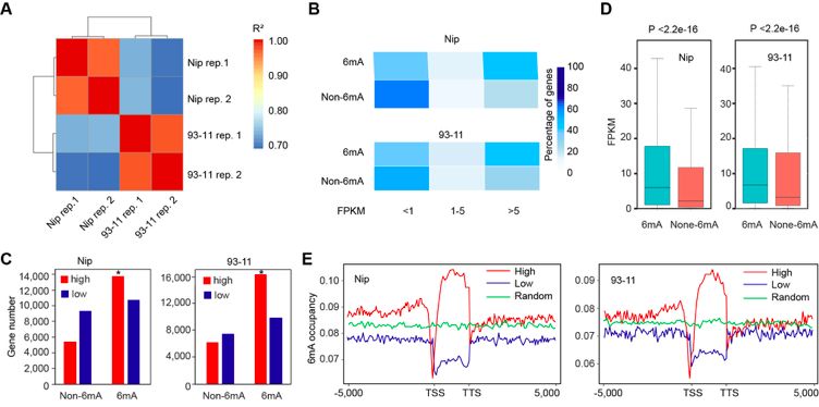 RNA-seq分析表明在Nip和93-11中,在6mA位點有大量的高表達基因甲基化,大量未甲基化基因在低水平表達。6mA甲基化基因的表達水平顯著高于非6mA基因,并且高表達基因顯示出較高的6mA占用率,特別是在啟動子和基因體區(qū)域中包含6mA位點的基因。6mA與水稻中的活性表達基因有關。5mC在水稻基因組中高豐度存在,影響基因表達,研究發(fā)現(xiàn)5mC和6mA之間沒有相關性(圖4)。