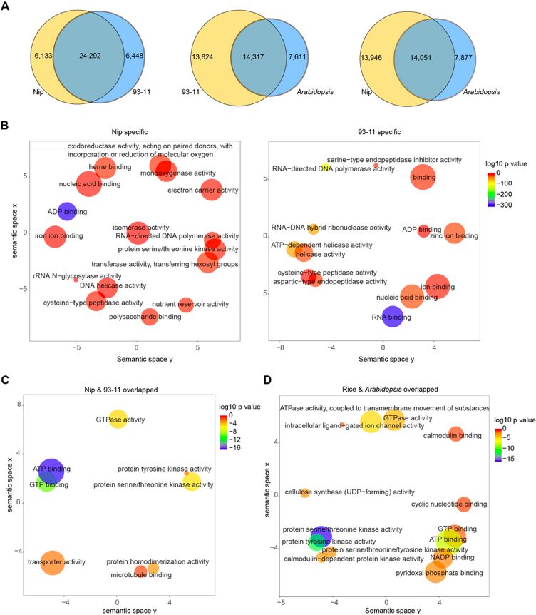 ? ? ??水稻Nip、93-11和擬南芥中6mA分布模式有幾個關鍵特征:6mA位點廣泛分布于所有染色體上,在著絲粒周圍異染色質(zhì)區(qū)域相對富集;在水稻中鑒定的富集motif與擬南芥中的motif非常相似;在水稻和擬南芥中均觀察到6mA在外顯子富集;6mA與水稻和擬南芥中的活性表達基因相關。在Nip,93-11和擬南芥中6mA甲基化同源基因比較發(fā)現(xiàn):大約80%的6mA甲基化基因在Nip和93-11之間重疊,大約一半的水稻(Nip或93-11)的6mA甲基化基因與擬南芥的6mA甲基化基因的三分之二重疊。GO分析表明6mA參與不同生物體中的許多不同功能(圖5)。
