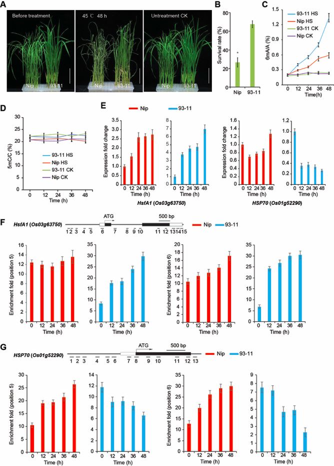 根據(jù)SMRT測序結(jié)果,篩選出候選的6mA修飾的熱脅迫相關基因,如熱休克轉(zhuǎn)錄因子A1(HsfA1)和熱休克蛋白70(HSP70)。HSFA1是熱脅迫反應的主要轉(zhuǎn)錄調(diào)控因子,其在非脅迫條件下受到HSP70的抑制。HSFA1功能缺失導致熱脅迫敏感表型。HsfA1HSP70表達的變化與其6mA水平的變化呈正相關,這可能是Nip和93-11之間熱脅迫耐受性差異的原因。