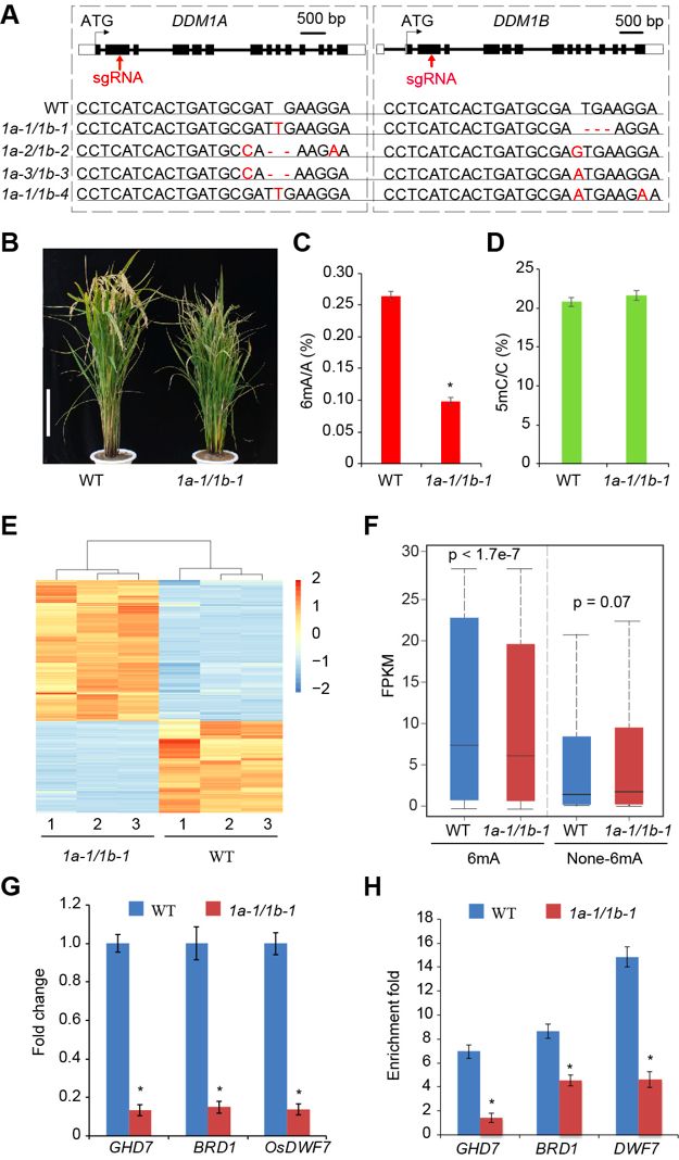 水稻基因組含有兩個DDM1同源基因DDM1aDDM1b,由于功能冗余,只有T-DNA插入單突變體產(chǎn)生的雙突變體DDM1a/1b表現(xiàn)出發(fā)育表型。然而,DDM1a/1b不產(chǎn)生活花粉,導致種子呈空殼和深色。用CRISPR-Cas9對Nip背景中的DDM1aDDM1b進行了有針對性的誘變,并鑒定了10個獨立的T1系用于DDM1a、DDM1b單突變和4個獨立的DDM1a/DDM1b(1a/1b)雙突變型。在任何不同類型的DDM1aDDM1b純合子單突變體中均未觀察到表型。與野生型植物相比,所有純合1a/1b系表現(xiàn)出相同的矮化表型。1a-1/1b-1顯示出降低的結(jié)實率,而另外3個雙突變體顯示不育。LC-MS/MS對DNA甲基化水平的定量測量顯示6mA水平顯著降低,但1a/1b植物中5mC水平變化不大。6mA-IPqPCR分析顯示,6mA水平在大多數(shù)隨機選擇的位點中顯著降低。RNA-seq結(jié)果表明野生型中6mA修飾基因的表達水平顯著高于1a-1/1b-1植物中的相同基因,野生型中非6mA基因與1a-1/1b-1植物中的相應基因之間沒有表達水平差異。結(jié)果表明6mA水平與基因表達呈正相關。