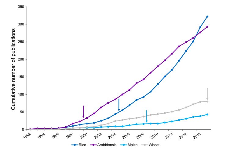 ATCG不規(guī)則的排列組合組成了地球上近870萬個物種形形色色的遺傳物質(zhì),而解密其內(nèi)在調(diào)控機制是生物工作者心心念念奮斗的目標。1977年,噬菌體ΦX174長達5375-bp基因組被測序完成,基因組測序事業(yè)開始蓬勃發(fā)展,時至今日,NCBI收錄了超過6000個真核生物和150,000個原核生物的測序數(shù)據(jù),其中包括禾本科。而基因組研究目的也從單純的科學研究向?qū)嵺`應用發(fā)生著轉(zhuǎn)換?;蚪M學和生物技術相結(jié)合,包括標記輔助選擇,基因組選擇和基因編輯,已成為育種中不可缺少的工具,功能基因的定位和克隆將會把這種技術的結(jié)合作用發(fā)揮更大。