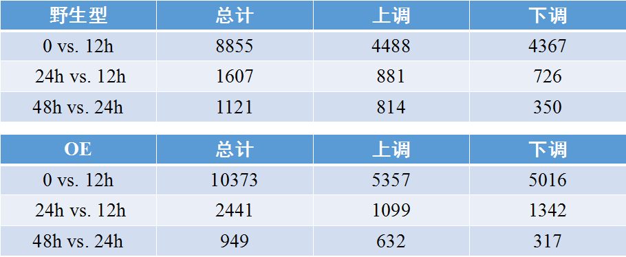 使用Illumina測序技術(shù)進(jìn)行轉(zhuǎn)錄組分析從而鑒定影響不定根生成的差異表達(dá)基因。不論在野生型還是過表達(dá)植株里,0h與12h的差異表達(dá)基因均多于12h vs. 24h和24h vs. 48h比較組。因此,在不定根誘導(dǎo)和萌發(fā)的前12h發(fā)生了大量基因的重塑。OE植株在前12h增加1518個差異表達(dá)基因,其中有119個基因在野生型的12h vs. 24h中出現(xiàn)(圖3)。這些結(jié)果表明,PagFBL1基因的高表達(dá)會增強(qiáng)促進(jìn)不定根形成的基因的表達(dá)變化。
