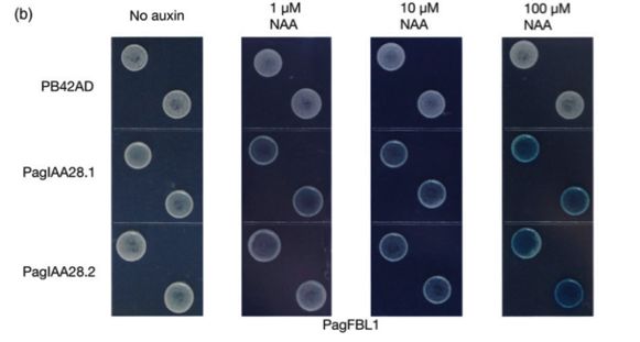 基于雙分子熒光互補(bǔ)研究結(jié)果,進(jìn)一步進(jìn)行酵母雙雜試驗(yàn)。結(jié)果表明,PagFBL1PagIAA28.1、PagIAA.28.2均有很強(qiáng)的結(jié)合,由此證明他們參與楊樹莖段不定根的誘導(dǎo)過程。
