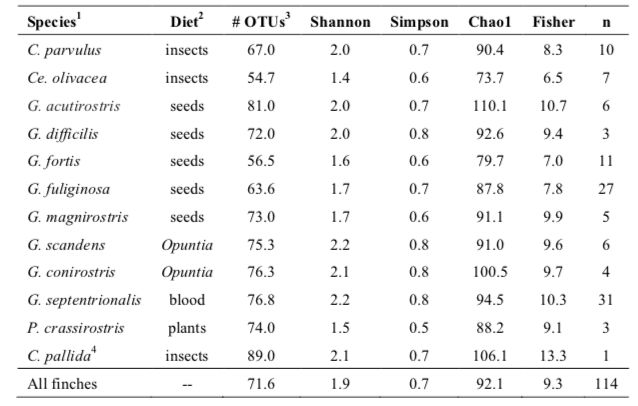 表1.?達(dá)爾文雀的樣本大小、食性分類以及α多樣性