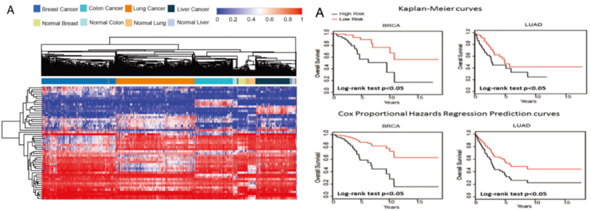 從TCGA中常見癌癥(肺癌、乳腺癌、結(jié)腸癌、肝癌)的甲基化數(shù)據(jù)中篩選癌癥標(biāo)記物,這些標(biāo)記物能非常準(zhǔn)確的(準(zhǔn)確度95%)區(qū)分開癌組織和正常組織。同時(shí)他們發(fā)現(xiàn)DNA甲基化模式可以預(yù)測(cè)預(yù)后和生存。