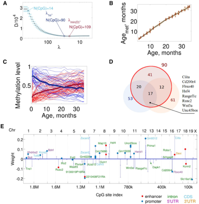 該研究對(duì)不同年齡階段的小鼠進(jìn)行RRBS研究,并找到了90個(gè)與年齡相關(guān)的CpG位點(diǎn)來構(gòu)建小鼠生物學(xué)年齡的預(yù)測(cè)器。這些位點(diǎn)的clock代表了衰老的生物標(biāo)志物,并可以用來確定生物體的生物學(xué)年齡,并進(jìn)一步干預(yù)衰老的速度。