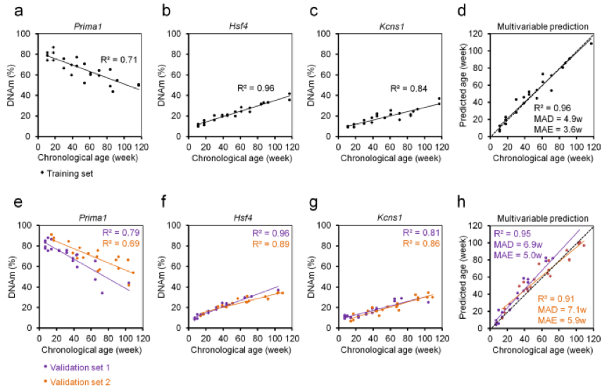 該研究從上述研究及其他研究中的基礎(chǔ)上選擇了9個(gè)甲基化區(qū)域在不同年齡段的小鼠血液樣品中進(jìn)行焦磷酸測(cè)序,建立年齡預(yù)測(cè)的模型,最后選擇了3個(gè)CpG位點(diǎn)(Prima 1, Hsf4, Kcns 1)來預(yù)測(cè)小鼠的年齡和壽命。