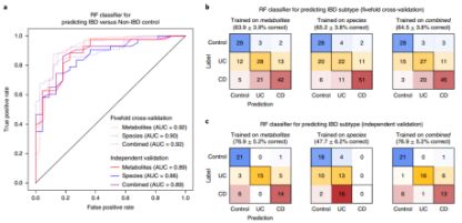 最后,本研究從代謝物、微生物菌“種”及兩者組合水平訓(xùn)練“隨機(jī)森林”(RF)分類器,鑒定IBD病癥和IBD子集,受試者工作曲線(ROC)描繪RF分類器的假陽性率和準(zhǔn)確率,混合矩陣評估PRISM隊列IBD子集RF分類器。結(jié)果顯示,所有RF分類器對IBD患者和健康人群的辨識效果良好,AUC值為0.86-0.92,交叉驗證結(jié)果(AUC:0.90-0.92)更優(yōu)于獨(dú)立驗證結(jié)果(AUC:0.86-0.89)(圖10.a)。PRISM隊列中,代謝物、微生物菌“種”及兩者組合水平預(yù)測UC、CD和健康人群的準(zhǔn)確率為64-65%,該結(jié)果雖然不如案例/對照成功,但仍高于隨機(jī)預(yù)測(正確率:30%)(圖10.b),將PRISM訓(xùn)練IBD子集RF分類器應(yīng)用于荷蘭人群時(用于人類疾病驗證),輸入數(shù)據(jù)類型之間差異較大(圖10.b)。