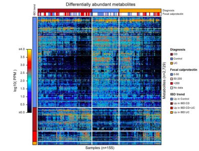 (圖2:IBD代謝物豐度熱圖,圖中顯示了2729種IBD(UC/CD)與健康組之間具有豐度差異的特征代謝物)