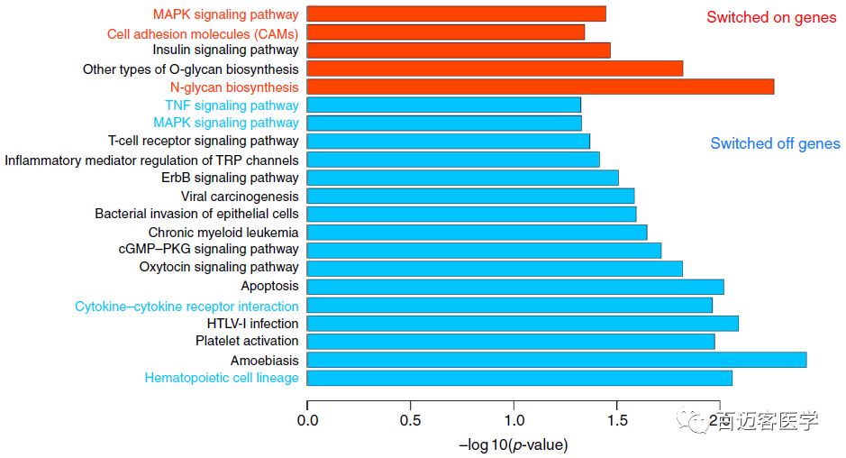 為了探討B(tài)細(xì)胞與MM細(xì)胞之間三維基因組變化導(dǎo)致的功能性影響,作者對(duì)位于MM細(xì)胞中6%的compartment B to A的基因組區(qū)域中的基因,以及1%的compartment A to B的基因進(jìn)行KEGG通路分析。通路富集分析顯示,這些基因與MM相關(guān)通路密切相關(guān),包括MAPK信號(hào)通路、N-glycan生物合成、TNF信號(hào)通路、細(xì)胞因子-細(xì)胞因子受體相互作用通路。
