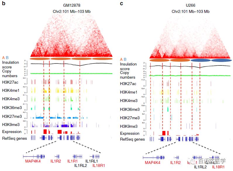 在A/B?compartment轉(zhuǎn)換區(qū)域內(nèi),發(fā)現(xiàn)了一個(gè)位于2q11.2-q12.1上的細(xì)胞因子受體基因簇,這個(gè)區(qū)域在正常B細(xì)胞中屬于compartment A,但在MM細(xì)胞中均為compartment B,并且與基因表達(dá)下調(diào)有關(guān),包括多個(gè)白介素IL1R1、IL1R2、IL18R1和細(xì)胞因子MAP4K4。這個(gè)位點(diǎn)的基因表達(dá)的變化與TAD結(jié)構(gòu)、表觀遺傳標(biāo)記相關(guān)聯(lián),但與拷貝數(shù)變化不相關(guān)。TAD邊界與在癌細(xì)胞中發(fā)生變化的IL1R2基因接近,癌細(xì)胞中活躍增強(qiáng)子標(biāo)記H3K27ac 和H3K4me1的信號(hào)減弱。結(jié)合Hi-C數(shù)據(jù)、WGS數(shù)據(jù)和基因表達(dá)數(shù)據(jù),可以在TAD和基因水平上將MM細(xì)胞中的空間紊亂和基因表達(dá)變化相關(guān)聯(lián)。