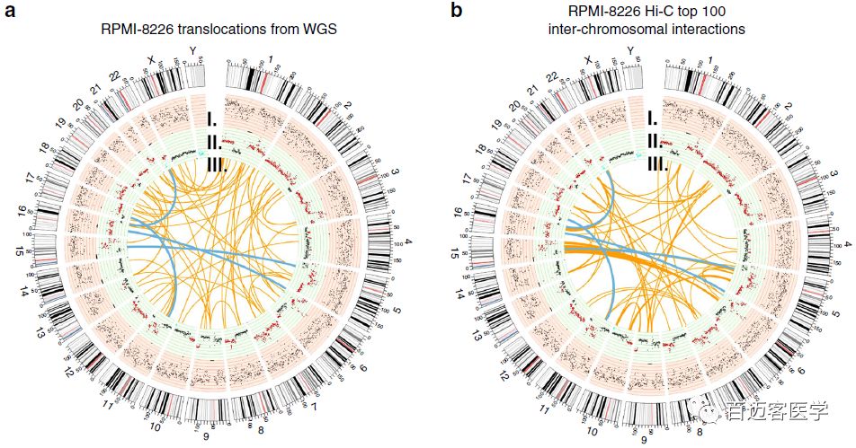 在RPMI-8226中,WGS鑒定出56個(gè)染色體間易位事件,其中四個(gè)也在top?100的Hi-C染色體間互作中,其中包括RPMI-8226的光譜核型(SKY)圖像中檢測(cè)到t(16,22)(q23,q11)的易位,涉及MM相關(guān)基因WWOXMAF。在U266細(xì)胞中,鑒定到了80個(gè)受易位事件影響的基因,包括癌癥相關(guān)基因TNIK、FBXW7、TRIM2,其中包含一些之前研究未發(fā)現(xiàn)的MM相關(guān)基因。此外距離易位位點(diǎn)1 Mb的基因中,有一半以上是相比于正常B細(xì)胞差異表達(dá)的。MM細(xì)胞系的染色體間整體互作count明顯高于正常B細(xì)胞。總的來說,這些結(jié)果表明,癌細(xì)胞基因組三維構(gòu)象受到染色體間易位的影響。
